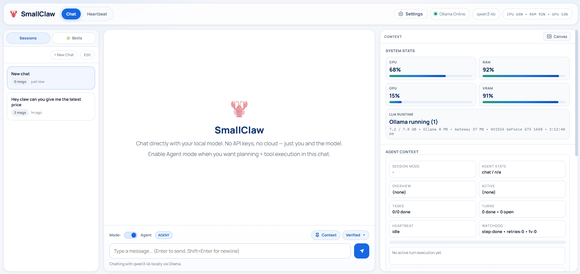 SmallClaw 定位很明确——一个本地优先的 AI Agent 框架,专为小模型优化,是 OpenClaw 的轻量级替代。